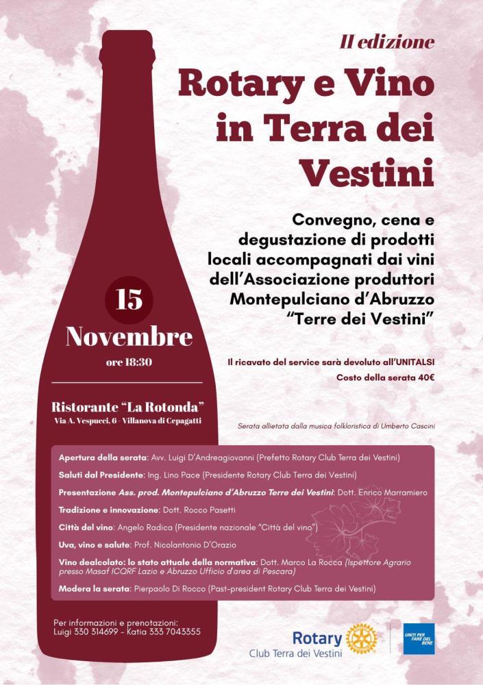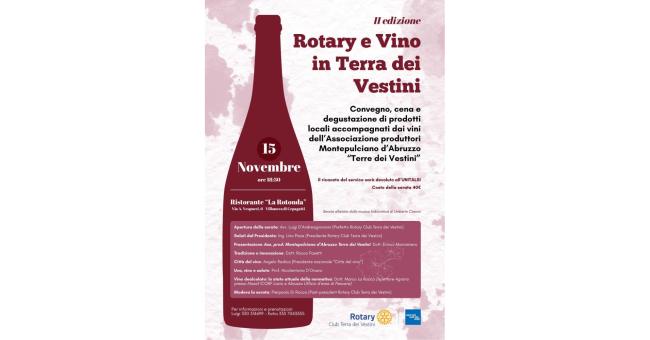 Sabato 15 novembre, nel ristorante La Rotonda di Villanova di Cepagatti, si svolgerà la seconda edizione di Rotary e Vino in Terra dei Vestini. La manifestazione sarà divisa in due parti, nella prima un convegno sul vino locale e una seconda con una cena di degustazione. Motivo conduttore della serata saranno i prodotti tipici del territorio abbinati ai vini Montepulciano d’Abruzzo Terre dei Vestini. L’idea è quella di creare un vero e proprio percorso sensoriale con quanto il territorio offre.