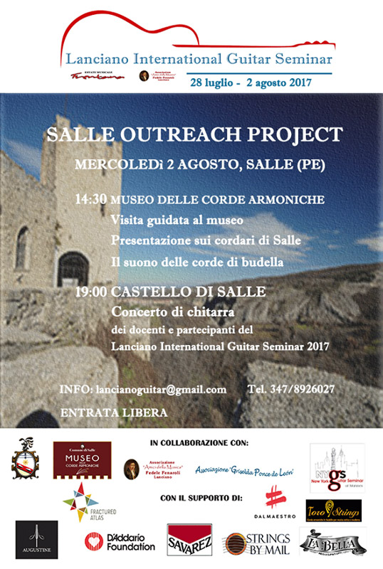 Mercoledì 2 agosto sarà di scena il Salle Outreach Project, che conclude la V° edizione del Lanciano International Guitar Seminar, è un progetto volto alla diffusione e conoscenza dell'antica tradizione della produzione delle corde armoniche, che vede nel piccolo paese di Salle, uno dei luoghi di origine, attualmente sede del Museo delle corde armoniche. Durante il seminario, i partecipanti saranno guidati nell'approfondimento e sviluppo delle abilità tecnico-interpretative del repertorio solistico e da camera nonché quelle di performative.