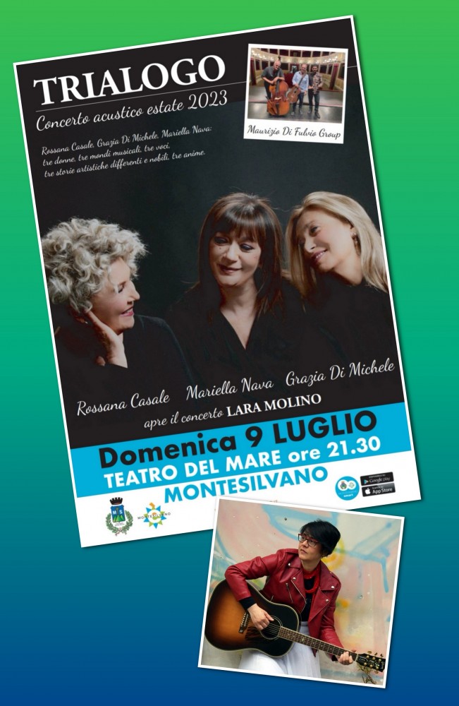 Domenica  9 luglio, a Montesilvano, presso il Teatro del Mare, la cantautrice abruzzese originaria di San Salvo, Lara Molino, aprirà il concerto di Mariella Nava, Rossana Casale e Grazia Di Michele