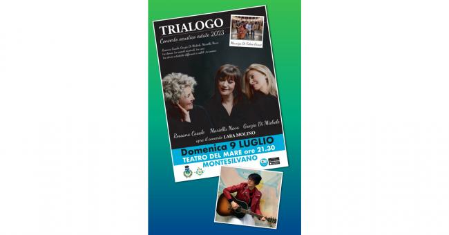 Lo spettacolo, organizzato dal Comune di Montesilvano, dal titolo "Trialogo", che vede protagoniste le tre artiste, inizierà alle 21:30. Lara Molino insieme alla sua chitarra e all'armonica a bocca, eseguirà diversi brani del suo repertorio in lingua italiana e dialetto abruzzese.