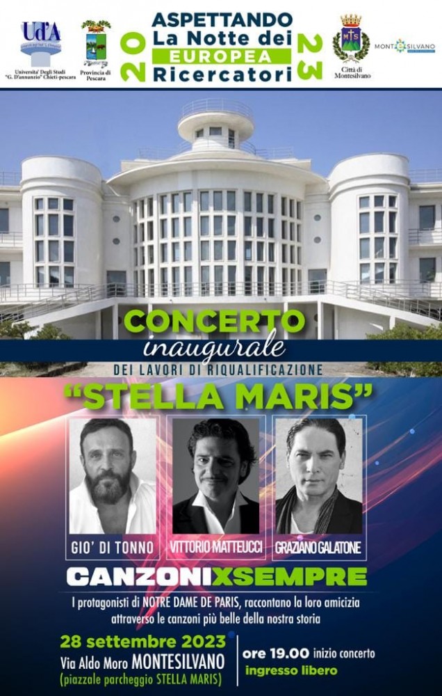 L'Università D'Annunzio, nell'ambito della Notte Europea dei Ricercatori, ha organizzato per questa sera, giovedì 28 settembre alle ore 19.00 nel parcheggio dell'ex colonia Stella Maris, lo spettacolo "Canzoni per Sempre" con Giò Di Tonno, Vittorio Matteucci e Graziano Galatone i tre protagonisti del celebre musical Notre Dame de Paris. Durante l'evento a ingresso libero, patrocinato dalla Provincia di Pescara e dal Comune di Montesilvano, verranno annunciati i lavori di riqualificazione dell'aeroplanino dopo l'accordo raggiunto nei mesi scorsi tra la Provincia e l'Università .