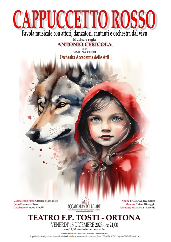 Venerdì 15 dicembre, al Teatro F. P. Tosti di Ortona, l'Accademia delle Arti porterà in scena Cappuccetto Rosso, uno spettacolo per tutta la famiglia (consigliato per bambini dai 3 anni in su).