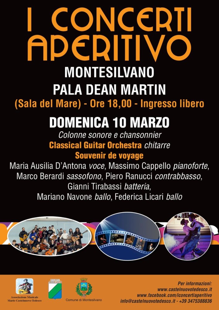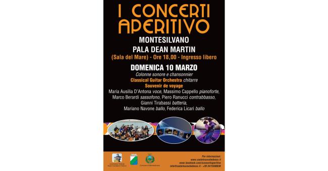 Dopo il grande successo dell'esordio, domenica 10 marzo dalle ore 18 torna al Pala Dean Martin il secondo appuntamento con il “Concerto Aperitivo” della rassegna “Primavera … che Spettacolo” proposta dall’amministrazione comunale in attesa dell’arrivo della primavera. Tema delle performances musicali: colonne sonore e chansonnier interpretate da “Classical Guitar Orchestra” e “Souvenir de voyage” con Maria Ausilia D'Antona voce, Massimo Cappello pianoforte, Marco Berardi sassofono, Piero Ranucci contrabbasso, Gianni Tirabassi batteria, Mariano Navone ballerino, Federica Licari ballerina.