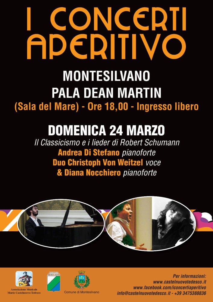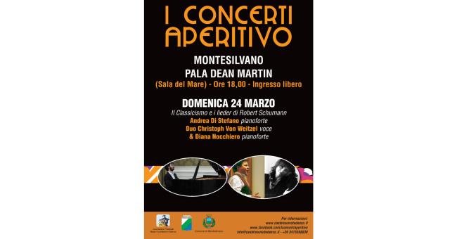 Domenica 24 marzo alle ore 18, nel Pala Dean Martin di Montesilvano, è in programma l'ultimo appuntamento con il “Concerto Aperitivo”. A chiudere i quattro appuntamenti domenicali inseriti nel più ampio cartellone degli eventi “Primavera che Spettacolo” proposti dal Comune di Montesilvano, sarà un affascinante pomeriggio liederistico sulle note di incantevoli canzoni romantiche.