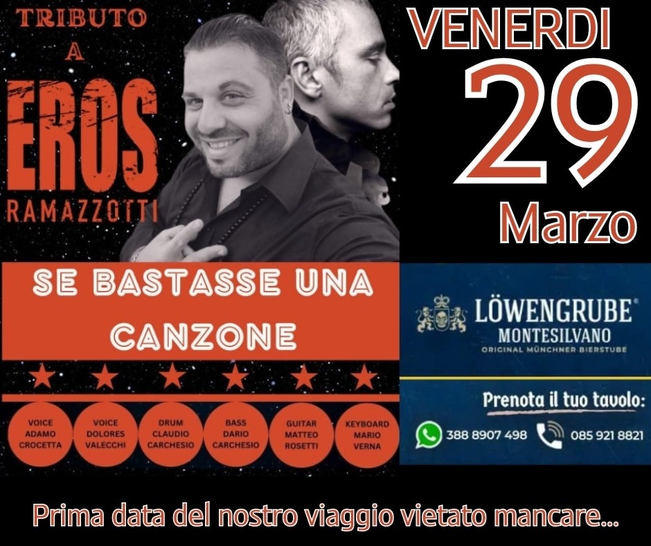 Nasce in Abruzzo la prima tribute band di Eros Ramazzotti. Un progetto che si chiama "Se bastasse una canzone" proprio come il titolo di una canzone di Eros e che porterà in giro per l'Abruzzo le più belle hit del cantante romano. Una band di ben 6 elementi formata da Adamo Crocetta, Dolores Valecchi, Claudio Carchesio, Dario Carchesio, Matteo Rosetti e Mario Verna, che venerdì 29 marzo dalle ore 22 al Lowengrube di Montesilvano, in corso Umberto, partiranno con la prima data del tour.