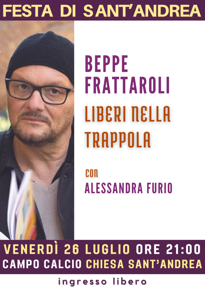 Beppe Frattaroli darà il via alla festa di Sant'Andrea con il suo spettacolo “Liberi nella trappola” nel campetto adiacente alla chiesa di Sant'Andrea a Pescara. L’evento si terrà venerdì 26 luglio alle ore 21. Ingresso libero. Frattaroli, noto per il suo eclettico percorso musicale, ha lavorato con alcuni dei nomi più illustri del teatro, del cinema, della letteratura e della musica leggera italiana e internazionale. Tra le sue collaborazioni spiccano Enrico Montesano, Ugo Pagliai, Paola Gassman, Sergio Zavoli, Dacia Maraini, Pupi Avati, Erri De Luca, Diana De Curtis (nipote di Totò), Eramo e Passavanti (Sanremo 1998), Tosca, Paola Turci, Ciro Caravano (Neri per caso), Giulio Golia (Le Iene), Antonella Bucci, Mauro Mengali (Oro), la cantante irlandese Kay McCarthy e la portoghese Margarida Guerreiro.