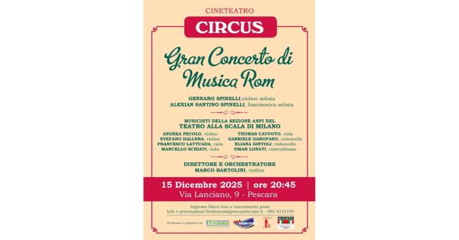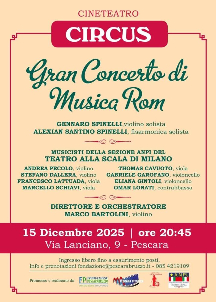 A Pescara il 15 dicembre prossimo, presso il cinema teatro Circus, della Fondazione Pescarabruzzo, si terrà un concerto molto atteso. Il gruppo musicale di Santino Spinelli si esibirà con i musicisti della Scala di Milano in un Gran Concerto Rom.