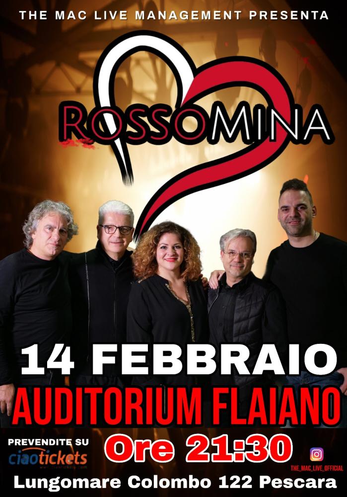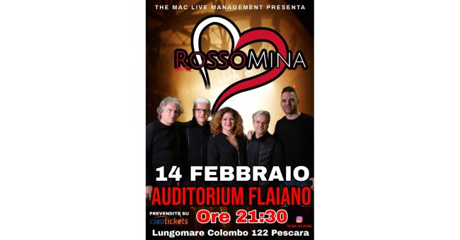 Sabato 14 febbraio alle ore 21.30 presso l'auditorium Flaiano si terrà il concerto Pmaggio a Mina “RossoMina“. I RossoMina nascono dall'idea della cantante Germana Ricotti e del chitarrista Fabrizio Paolemilio per celebrare gli 80 anni della più grande cantante italiana, Mina, e i suoi successi indimenticabili entrati nella storia della musica.