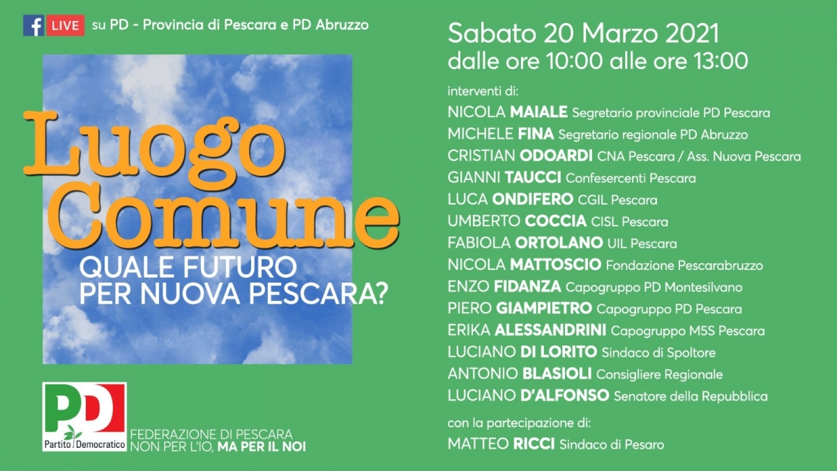 Per questo sabato 20 marzo, dalle ore 10:00 alle ore 13:00, sulla pagina Facebook PD – Provincia di Pescara e su PD Abruzzo, si svolgerà una tavola rotonda dal titolo "Luogo Comune. Quale futuro per Nuova Pescara?" cui prenderanno parte, i rappresentanti di CNA e Confesercenti, di CGIL, CISL, UIL, il Presidente della Fondazione Pescarabruzzo Nicola Mattoscio, il capogruppo PD al Comune di Montesilvano e Presidente della Commissione Statuto Enzo Fidanza, il capogruppo PD al Comune di Pescara Piero Giampietro, la capogruppo del Movimento 5 Stelle nonché candidata alla presidenza della Prima Commissione Erika Alessandrini, il Sindaco di Spoltore Luciano Di Lorito, il consigliere regionale democratico Antonio Blasioli, il Senatore dem Luciano D'Alfonso oltre ai segretari provinciale e regionale del PD Nicola Maiale e Michele Fina. All'incontro parteciperà , inoltre, il Sindaco di Pesaro Matteo Ricci, con un contributo sulla macroregione Adriatica.
