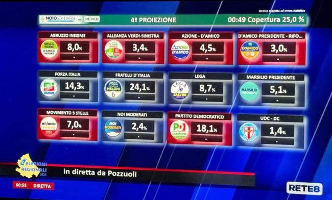 In base al primo exit poll (campione 75%) del sondaggista Antonio Noto, in esclusiva per Rete8, alle elezioni regionali in Abruzzo, il presidente uscente della Regione Abruzzo e candidato di centrodestra Marco Marsilio è al 48,7-52,7% mentre lo sfidante Luciano D'Amico, appoggiato dal centrosinistra, è al 47,3-51,3%.