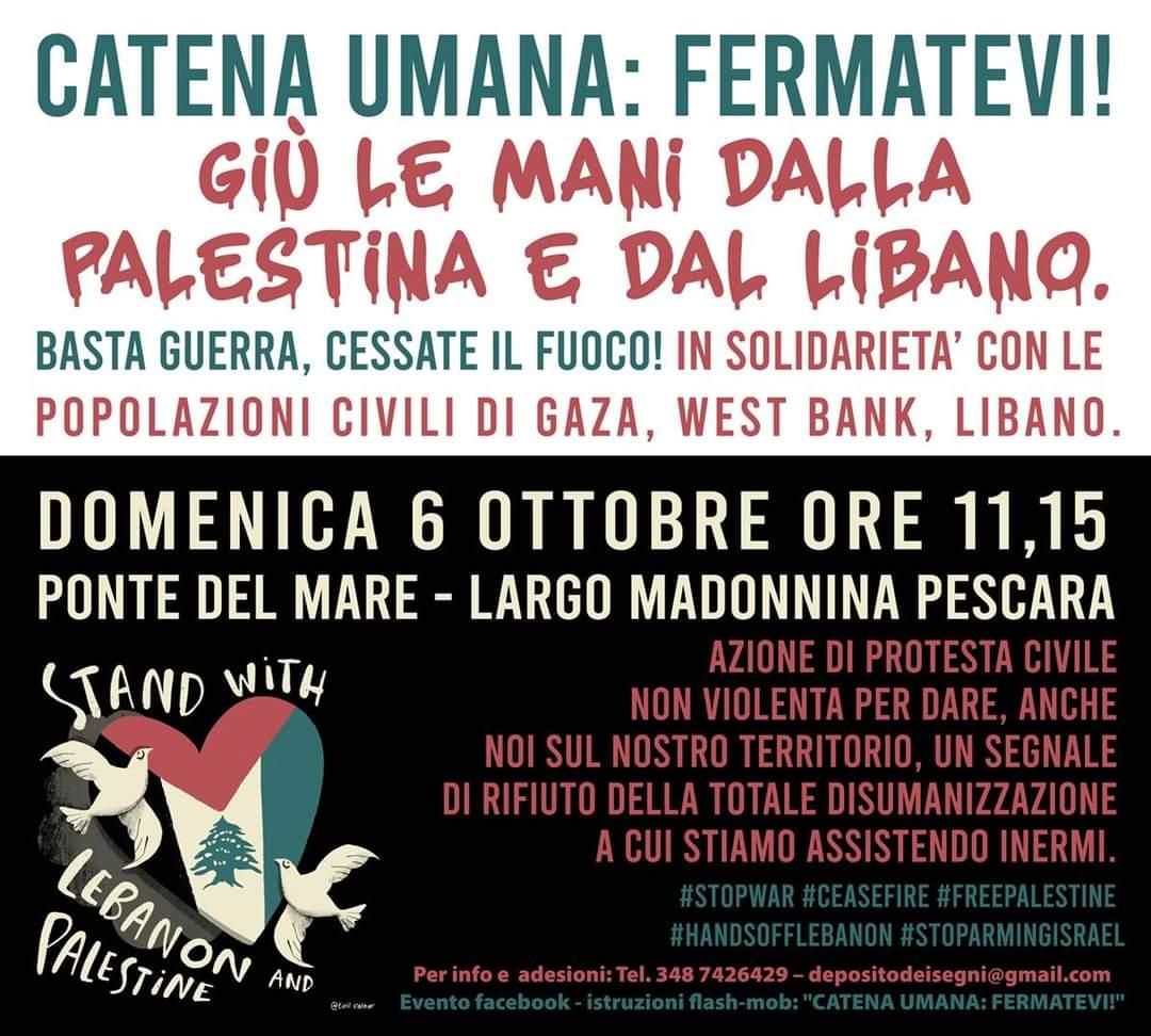 Domenica 6 ottobre, alle ore 11.15, un silente messaggio di orrore e una richiesta di pace saranno simbolicamente lanciati dal Ponte del Mare a Pescara. Tutti vestiti di nero, con le mani colorate di rosso, una catena umana simbolo del lutto per le vittime innocenti della guerra in Palestina e Libano. L’iniziativa, promossa da Cam Lecce e Jorg Grünert dell’associazione Deposito dei Segni, vedrà la partecipazione di oltre 40 associazioni del territorio, tra cui la Cgil di Pescara.