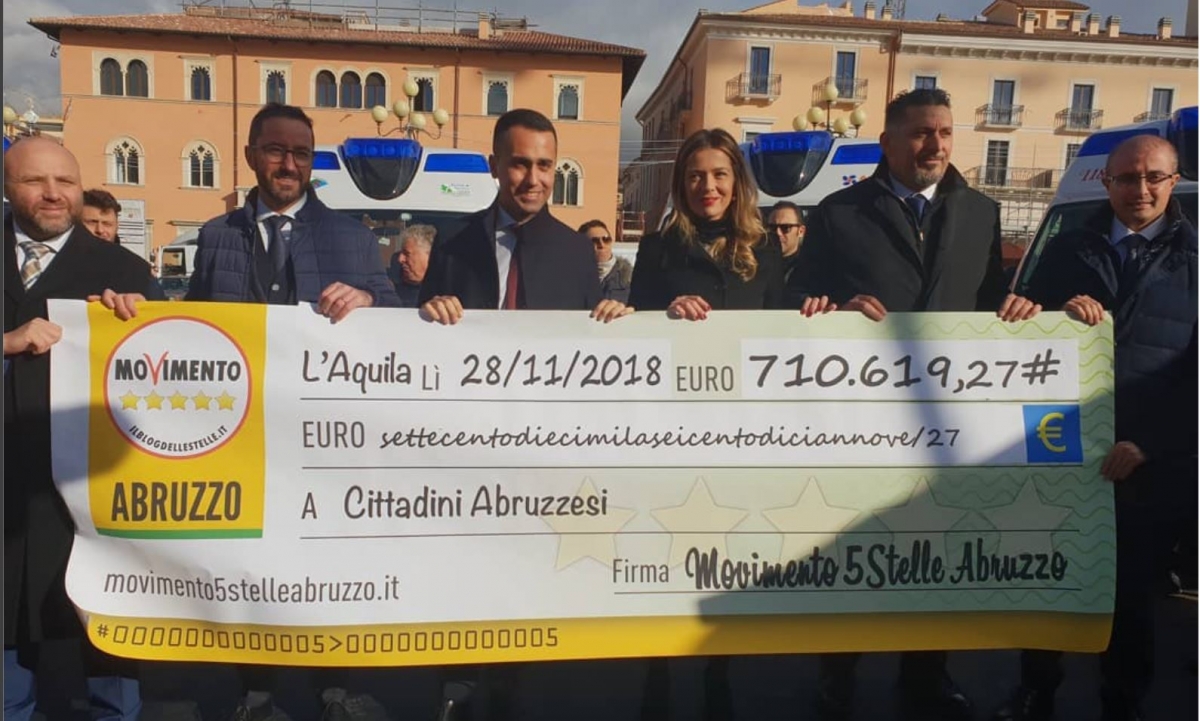 La politica del buon senso dà vita ad atti concreti per la comunità . Grazie al fondo accantonato dai consiglieri regionali Sara Marcozzi, Domenico Pettinari, Pietro Smargiassi, Riccardo Mercante e Gianluca Ranieri, il M5S in Abruzzo ha già creato il fondo per il Microcredito Abruzzo, che ha finanziato oltre 80 aziende abruzzesi sul territorio; acquistato una Turbina Spalaneve per la Protezione civile abruzzese; dato vita al Contest di Idee Riscattiamo Bussi, per i giovani progettisti abruzzesi che hanno elaborato progetti sulla riconversione del S.I.N Bussi. Le restituzioni dei consiglieri regionali sono consultabili sul sito tirendiconto.it.