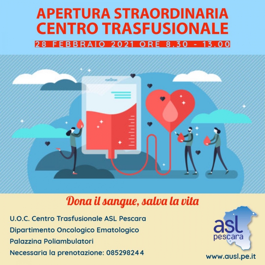 Per permettere al maggior numero di persone di donare il sangue domenica 28 febbraio 2021 il Centro Trasfusionale della ASL di Pescara sarà aperto dalle ore 8.30 alle ore 13.00. È necessaria la prenotazione al numero Fidas 085298244. Donare il sangue e gli emocomponenti è importante anche e soprattutto in questo tempo di Covid-19: le necessità di sangue sono infatti aumentate sia per l’area Covid sia per il flusso continuo nelle sale operatorie. Ogni giorno molte persone necessitano di trasfusioni per poter sopravvivere. La dott.ssa Patrizia Accorsi, Direttrice del Centro Trasfusionale, invita i donatori e i cittadini a compiere questo importante gesto e “ad usufruire anche dell’apertura di domenica per donare il sangue in piena fiducia delle nostre strutture trasfusionali, in grado di garantire elevati livelli di sicurezza per i donatori e per i pazienti”. Durante la pandemia da Covid-19 la donazione di sangue rientra tra le "situazioni di necessità" per le quali è consentito spostarsi.