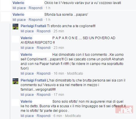 A quel punto è arrivato il duro e scurrile commento del tifoso pescarese con riferimenti anche al Vesuvio, al quale ha replicato direttamente il portiere dal suo profilo Facebook con la frase "Ti sfondo anche a te co****ne". Dopo numerose offese la diatriba è terminata con le scuse del tifoso biancoazzurro nei confronti di Frattali, quest'ultimo ha poi precisato di essere intervenuto perchè irritato dalle offese rivolte alla sua famiglia e al popolo Irpino.
