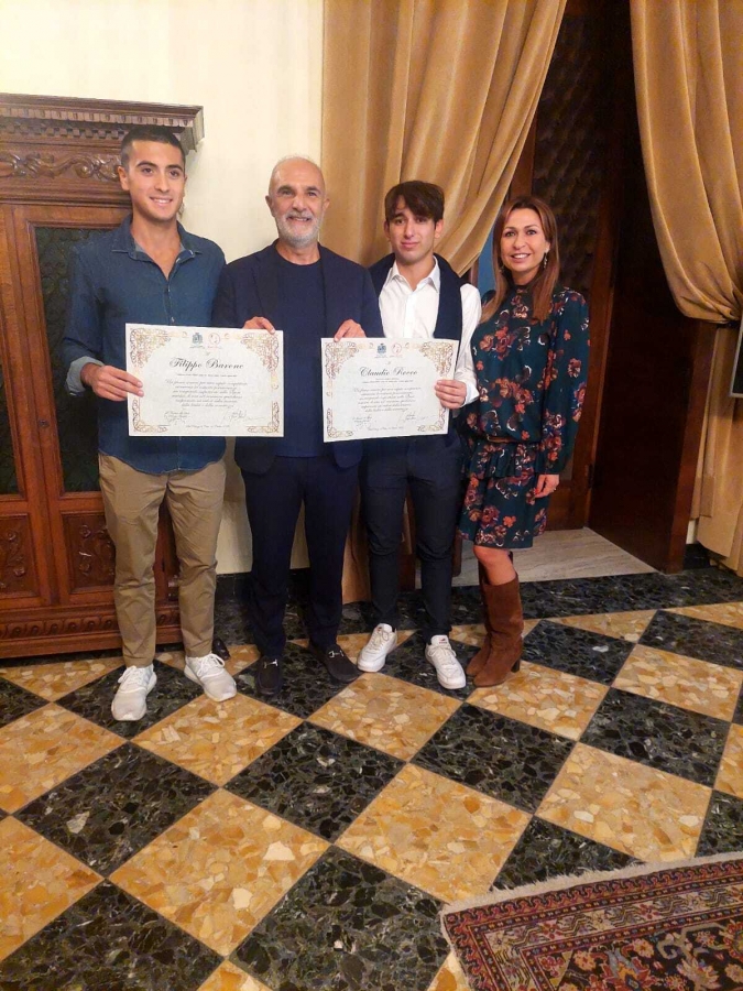 “Rappresentano i sani valori dello sport, dell’agonismo positivo, della solidarietà pur nella competizione, e a soli 17 anni sono già Campioni d’Italia di Beach Volley Under 18. Sono Claudio Rocco e Filippo Barone che l’amministrazione comunale ha voluto premiare con una pergamena quale riconoscimento e ringraziamento per essere due straordinari testimonial della nostra Pescara al di fuori dei confini regionali”.