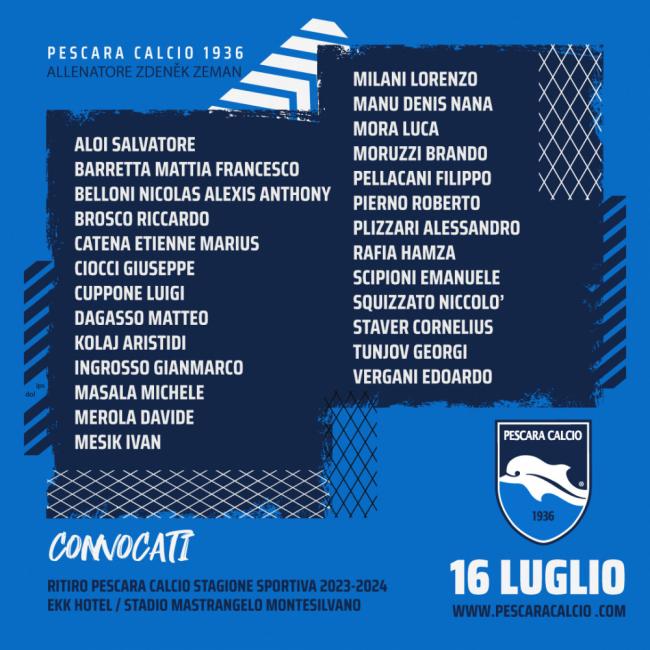 Parte oggi il ritiro del Pescara verso la nuova Serie C 2023-24. I biancazzurri allenati da Zdenek Zeman si alleneranno allo stadio Mastrangelo di Montesilvano alle 8:00 e alle 17:00. Nella serata di ieri la società ha diramato i 26 convocati per il ritiro.
