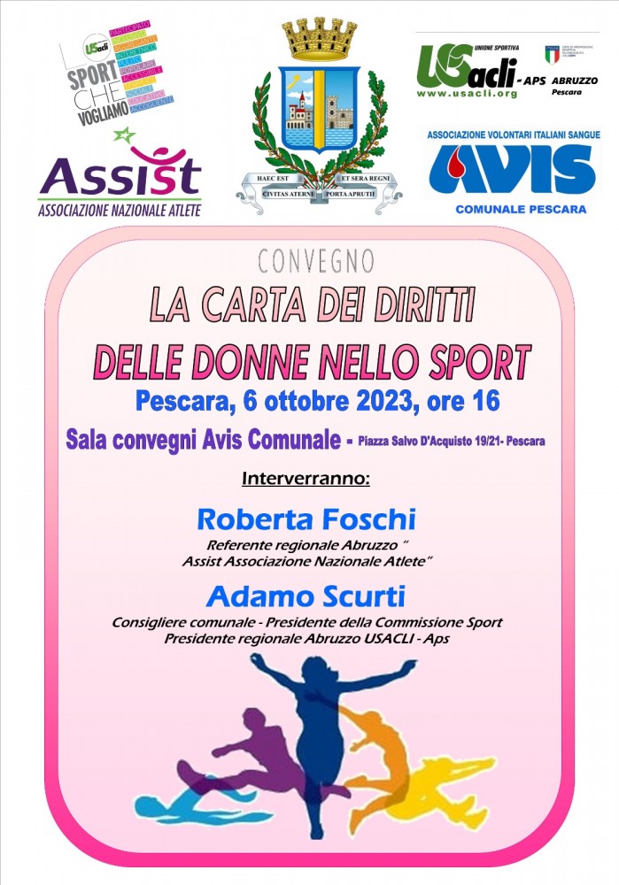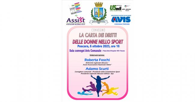 Si terrà venerdì 6 ottobre 2023 dalle ore 16 il convegno dal titolo La carta dei diritti delle donne nello sport all’interno della salva convegni Avis comunale in piazza Salvo D’Acquisto, 19/21 Pescara.