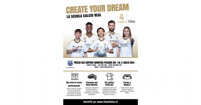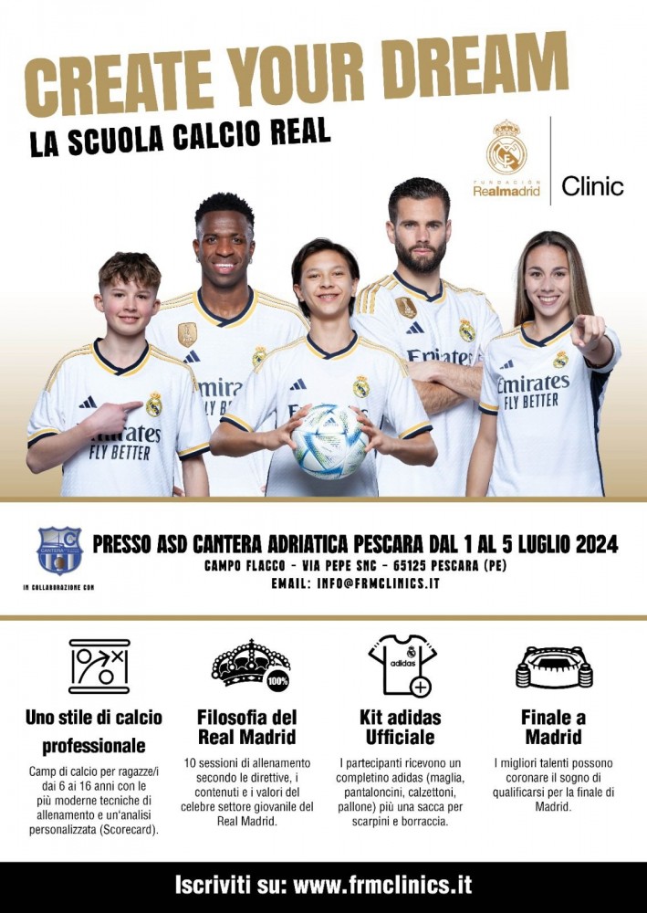 Tutto confermato: la Cantera Adriatica si conferma una scuola calcistica… Real! La società del patron Massimo Giannetti ha annunciato il rinnovo della partnership con uno dei club più importanti al mondo, il Real Madrid, che tornerà a Pescara la prossima estate per la terza edizione del clinic che si terrà dal 1° al 5 luglio prossimi.