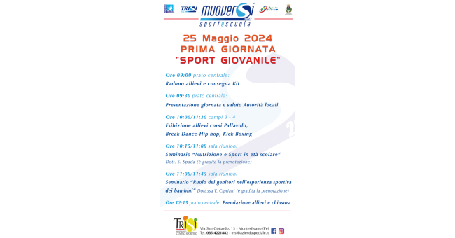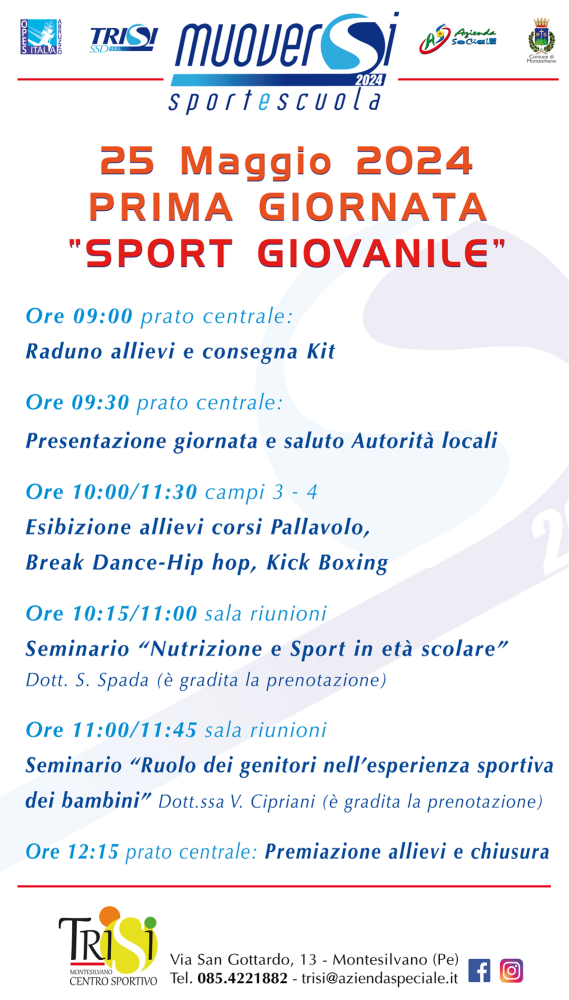 Sabato 25 maggio, presso il Centro Sportivo Trisi di Montesilvano, si celebrerà la prima giornata di sport giovanile a conclusione del Progetto Muoversi, organizzato dalla Società Sportiva Dilettantistica Trisi, in collaborazione con l’Ente di Promozione Sportiva e Terzo Settore OPES Abruzzo, Azienda Speciale per i Servizi Sociali e Comune di Montesilvano, che ha accolto cento studenti delle scuole dell’obbligo di Montesilvano.