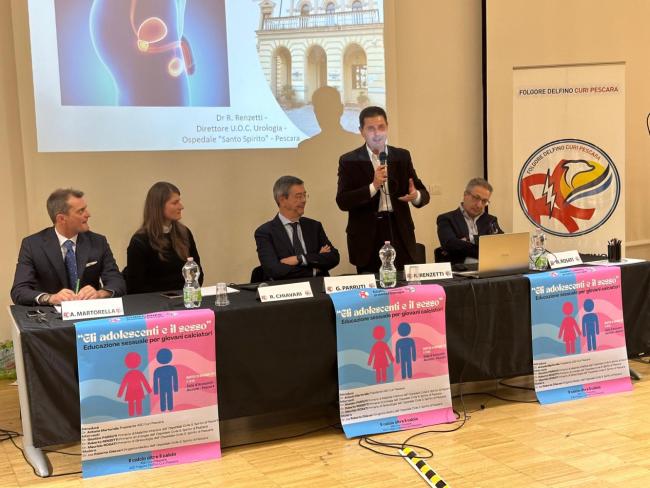 Giustino Parruti, primario di Malattie Infettive dell’Ospedale Civile S. Spirito di Pescara, Roberto Renzetti, primario di Urologia dell’Ospedale Civile S. Spirito di Pescara, e Maurizio Rosati, primario di Ginecologia dell’Ospedale Civile S. Spirito di Pescara riuniti allo stesso tavolo per parlare ai giovani calciatori della Curi Pescara di educazione sessuale. Un evento unico nel suo genere, probabilmente il primo nell’ambito del calcio dilettantistico a livello non solo locale, ma nazionale. L’idea del presidente Antonio Martorella fa centro e regala una serata di grandissimo interesse nella sala d’Annunzio dell’Aurum. Con tanto di blitz a sorpresa del sindaco Carlo Masci. “Siamo il secondo club calcistico di Pescara, dopo la Pescara calcio, sul territorio comunale. Siamo fieri e orgogliosi di portare avanti questo progetto con Quinto Paluzzi e i fratelli Liberatore di poter offrire ai nostri ragazzi e alle loro famiglie servizi come questo. Speriamo che questo incontro serva loro per capire come comportarsi per evitare errori che possono anche rovinare le loro vite”.