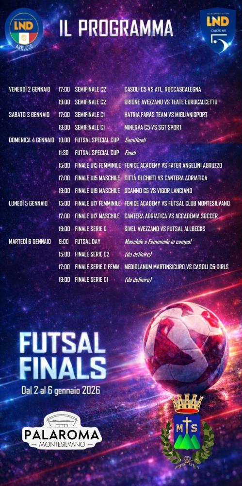 Dal 2 al 6 gennaio Montesilvano ospiterà la 13ª edizione della Final Four di Coppa Italia di Calcio a Cinque, organizzata dalla LND Abruzzo, con un programma che comprende anche la 9ª edizione del Futsal Day maschile e femminile e la prima edizione del Trofeo Futsal Special Cup.