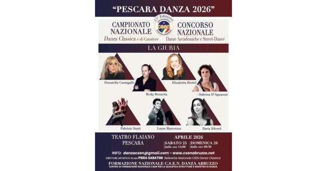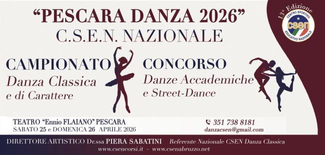 Sabato 25 e domenica 26 aprile 2026 si svolgerà, presso il Teatro Ennio Flaiano di Pescara, la tredicesima edizione del Campionato Nazionale C.S.E.N “Danza Classica e di Carattere” e del CONCORSO Nazionale per le “Danze Accademiche” e “Street Dance” “PESCARA DANZA 2026”. Presentano la due giorni Donatella Del Duca e Andrea Sebastiani.
