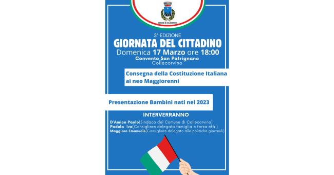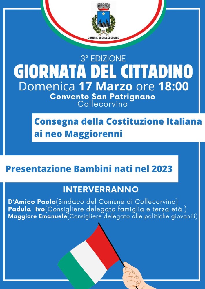 Nel pomeriggio di oggi, domenica 17 marzo, alle ore 18 presso il Convento di San Patrignano a Collecorvino, in occasione della Giornata del Cittadino ci sarà la cerimonia di consegna della Costituzione Italiana ai neo maggiorenni del territorio. Inoltre ci sarà la presentazione dei bambini nati nell'arco dell'anno 2023.