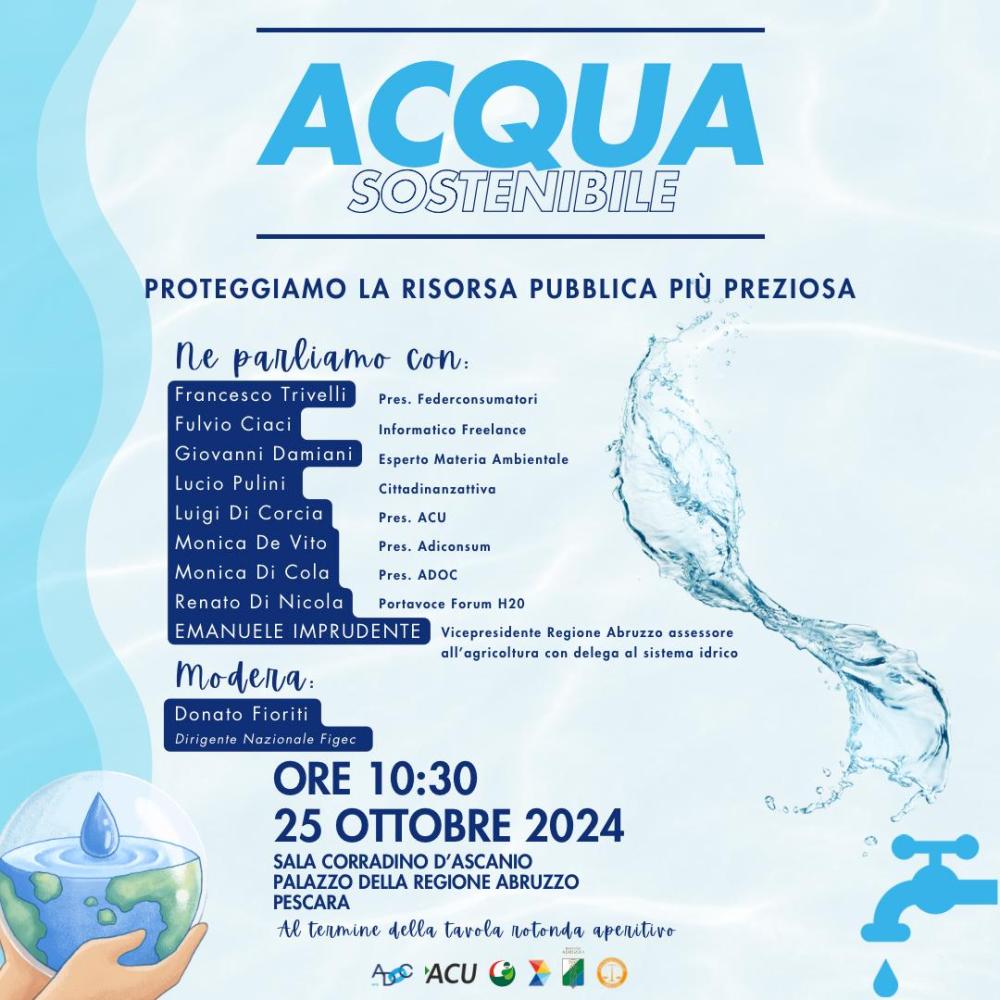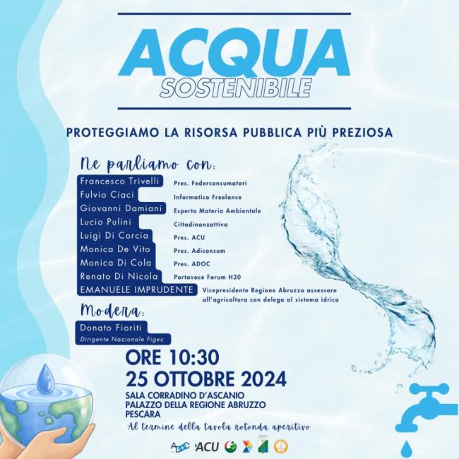 Si terrà il prossimo 25 ottobre, alle ore 10:30, nella sala Corradino D'Ascanio del palazzo della Regione Abruzzo a Pescara, la tavola rotonda dal titolo "Acqua Sostenibile: proteggiamo la risorsa pubblica più preziosa", un evento dedicato alla tutela e alla sostenibilità della risorsa idrica pubblica. L'incontro, promosso da Adiconsum, Adoc, Acu Contribuenti Abruzzo e Federconsumatori, vedrà la partecipazione di autorevoli esperti del settore, rappresentanti delle associazioni dei consumatori e attivisti per l'ambiente.