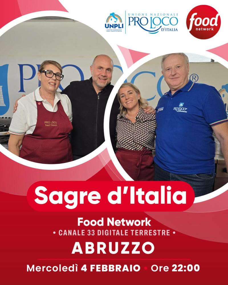 «Con Sagre d’Italia, il programma tv in onda su Food Network, grazie alla collaborazione di Giusina Battaglia, UNPLI prosegue l’attività di comunicazione televisiva per valorizzare le comunità e le tradizioni che rendono unico ogni territorio – dichiarano Antonino La Spina e Sandro Di Addezio, rispettivamente presidente nazionale e regionale UNPLI – Raccontiamo alcune Sagre di qualità selezionate in tutta Italia, eventi che le Pro Loco organizzano con passione per promuovere l’eccellenza dei prodotti tipici e la ricchezza culturale delle nostre realtà locali. Grazie all’impegno dei volontari e delle Pro Loco sui territori, offriamo un racconto autentico dell’Italia dei paesi, dove le sagre tengono viva la memoria dei sapori e delle tradizioni popolari».