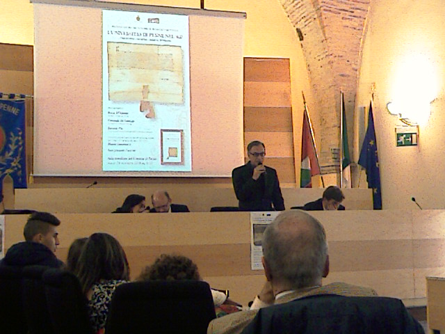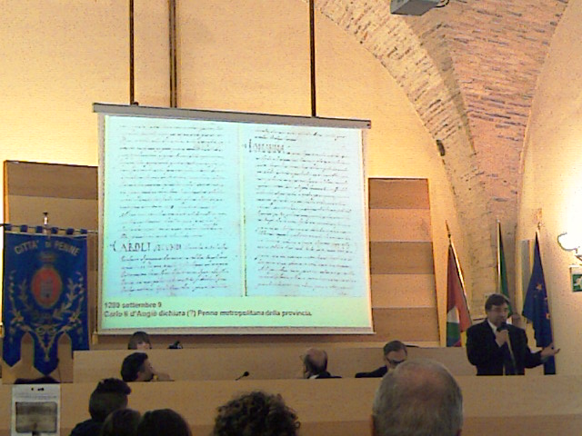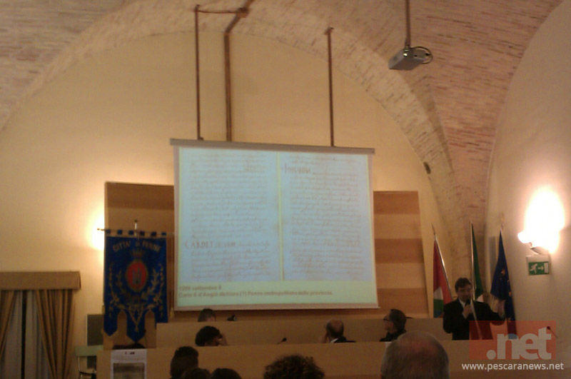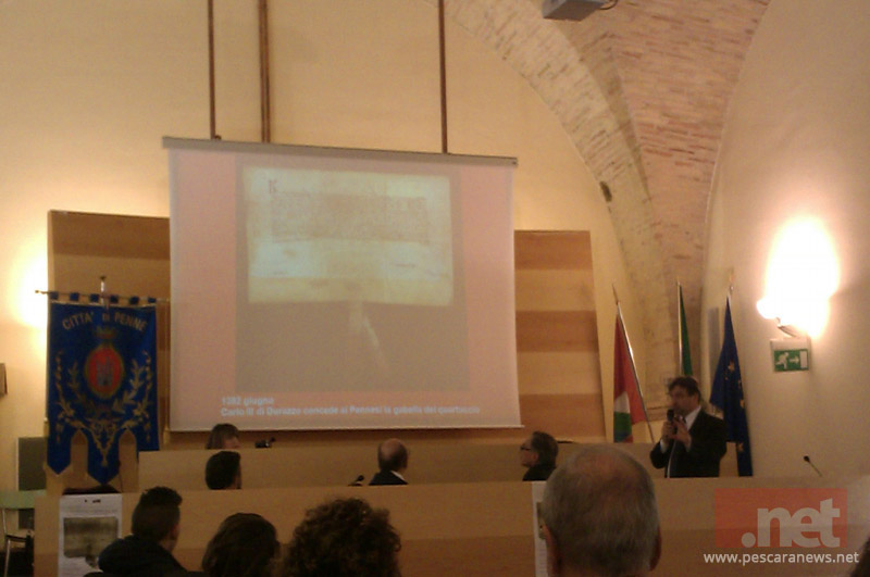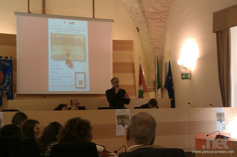 Una volta immersi totalmente nel clima medievale, sarà il professor Berardo Pio ad esporre dettagliatamente il contenuto del volume. Si presenta come un fiero amante del territorio e dei personaggi pennesi, ricordando Francesco Federico Falco che alla richiesta di una sua fan di aggiungere qualcosa sotto la firma rispose scrivendo “cittadino di Penne”. «Per comprendere appieno il significato del libro ed evitare errori comuni – spiega – è bene studiare a fondo la storia del territorio di appartenenza molto più di quella generale studiata nelle scuole. “L’Universitas di Penne nel 400. Autonomia cittadina, cultura, territorio", ultimo della trilogia che comprende “L’inventario dell’archivio di Penne” e “Le cancellerie delle universitates meridionali. Gli esempi di Penne e di Sulmona”, è un libro complesso scritto sulle basi di documenti storici ricercati e studiati attentamente dall’autore (alcuni dei quali scansionati e proiettati in sala durante l’esposizione). Al suo interno si da grande importanza alla universitas di Penne, ripercorrendo gli avvenimenti storici estrapolati dai suddetti documenti, dando particolare rilievo al Codice Catena, che sta alla base della civiltà di Penne». Dopo un breve excursus storico, ricco di entusiasmo e trasporto, conclude sottolineando nuovamente l’importanza del vissuto quotidiano per la creazione di una consapevole coscienza cittadina, riportando le parole di Gaber “la libertà è partecipazione”.