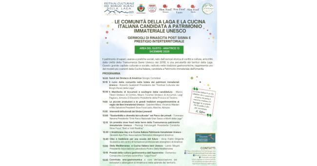Pertanto, coerentemente con il Dossier di candidatura le organizzazioni firmatarie, accogliendo con grande soddisfazione la proclamazione finale del prestigioso riconoscimento arrivata in sede UNESCO, si ritrovano nella giornata di sabato 13 dicembre ad Amatrice, alle ore 10.00 presso l’Area del Gusto, per aprire il Manifesto ad ulteriori adesioni istituzionali ed alle realtà attive sul territorio, proponendo contestualmente i borghi rurali dei Monti della Laga come presidi culturali della Cucina Italiana Patrimonio Immateriale UNESCO, e alle comunità, depositarie viventi di questi Beni, di assumersi il compito di custodire e valorizzare questo patrimonio e trasmetterlo alle nuove generazioni.